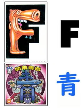 下記は「ビックリマンシール」の「漢熟覇王」シリーズで、キャラクターの太線個所が漢字になっているというもの。