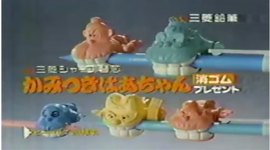 80年代に、シャープペンシルの替え芯を購入したら、文房具屋で「くじ引き」ができたのです。それで当たれば、「かみつきばあちゃん消しゴム」がもらえたのです。