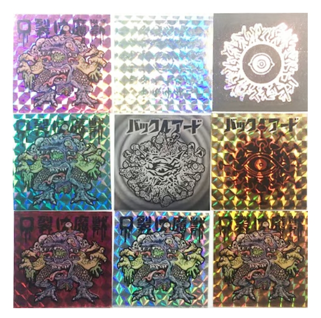 例えば、バックベアードの下段は白印刷が必要ない素材にしたりとか、この「口裂け魔獣」シールとかも、名前の個所を黒印刷のみにしてますよね?