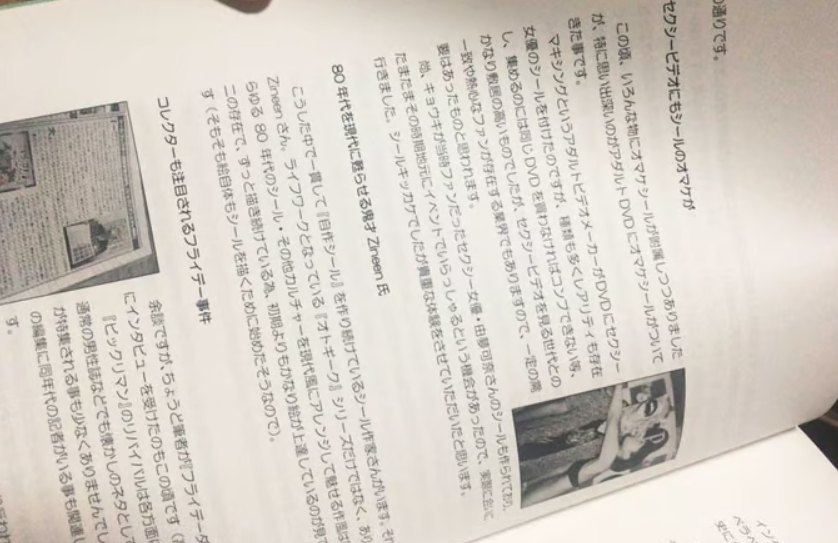 内容としては、メジャーシールの発展と、マイナーシール、自作シールの関係性や進化論みたいな感じ。あとは裏書という文化に対する考察や、江戸時代の浮世絵を光らせる技術を「キラ」と呼ぶのとシールの「キラ」の関係性など。文字主体ですね。
