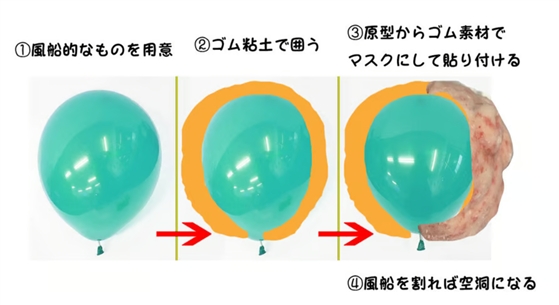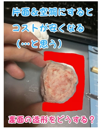 レジンは効果時間が短いため案外楽に中空にして作れるのだが、ゴム素材では、硬化時間が長いので両面のつなぎ目を貼り合わせるという手法など、なかなか手間のかかるやり方ばかり…